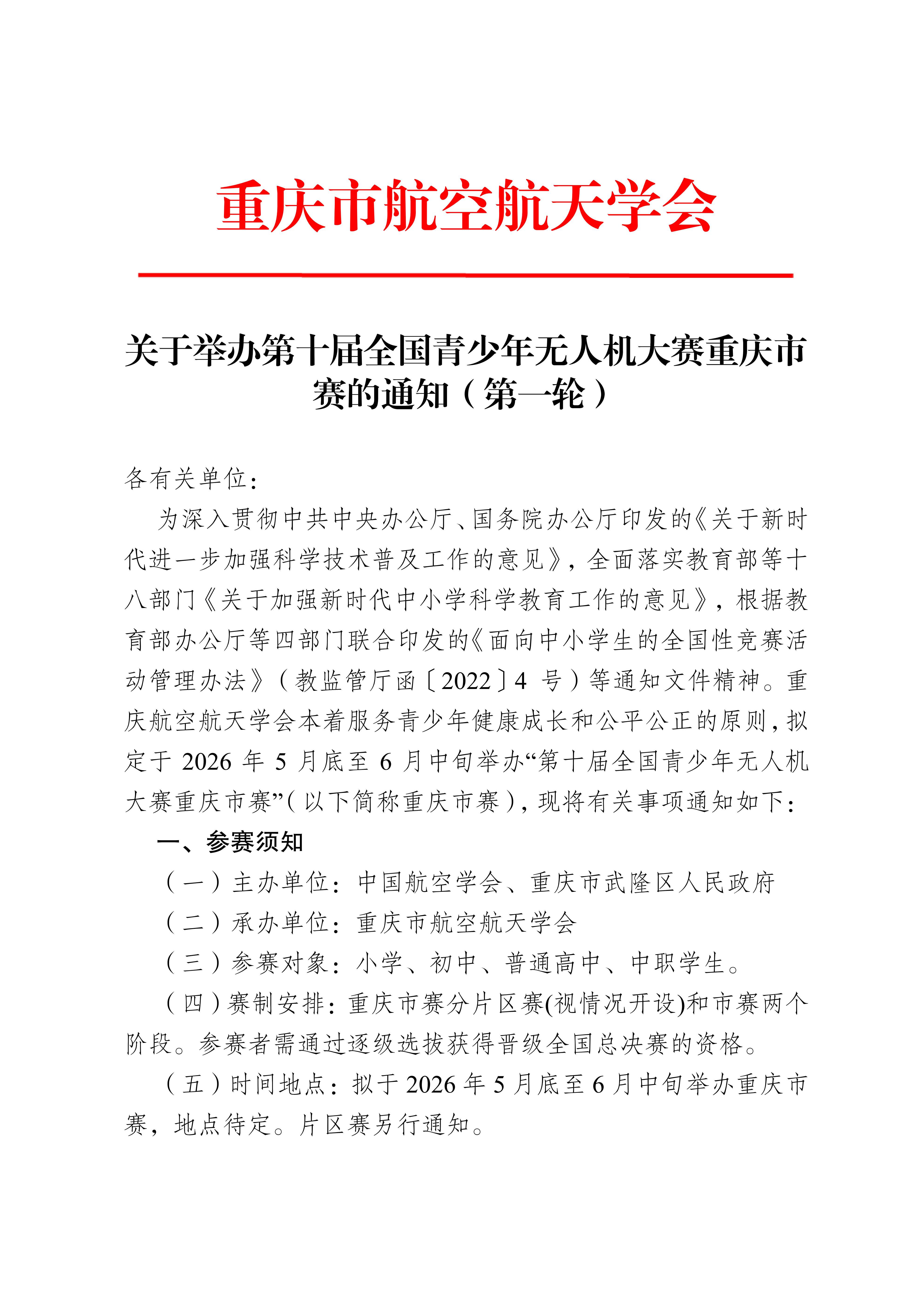 关于 关于举办第十届全国青少年无人机大赛(重庆市赛)的通知(第一轮)